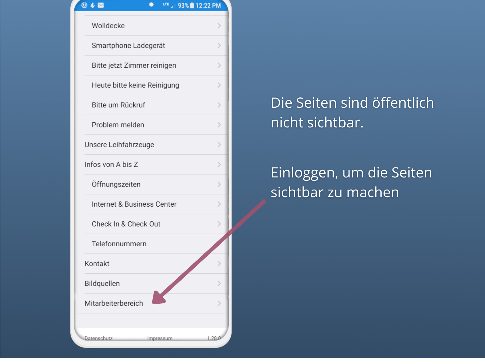 Um geschützte Seiten einzusehen, klicken Ihre Mitarbeiter in der Gästemappe auf "Mitarbeiterbereich" und loggen sich ein: